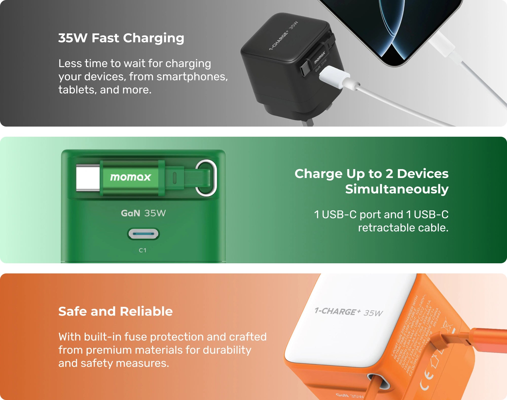 This portable GaN-powered 35W charger offers fast, efficient charging for various devices, leveraging innovative GaN technology, intelligent charging management, a built-in retractable USB-C cable, wide compatibility, and enhanced safety features for a superior on-the-go charging experience.