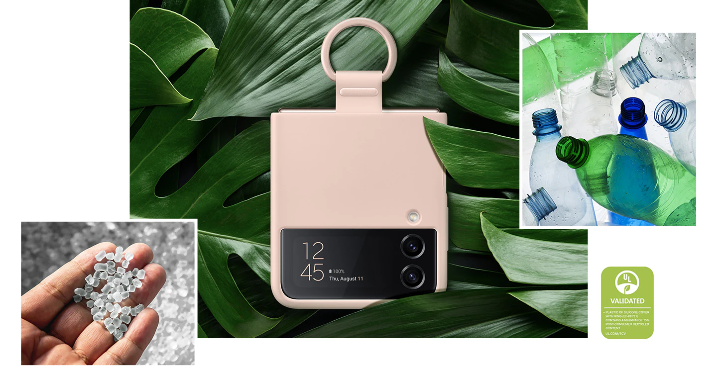 Simply doing our share. All Galaxy Z Flip4 cases are now applied with UL-certified recycled or bio materials that renew consumer waste into meaningful value by minimizing emissions, maximizing efficiency and conserving our precious resources.